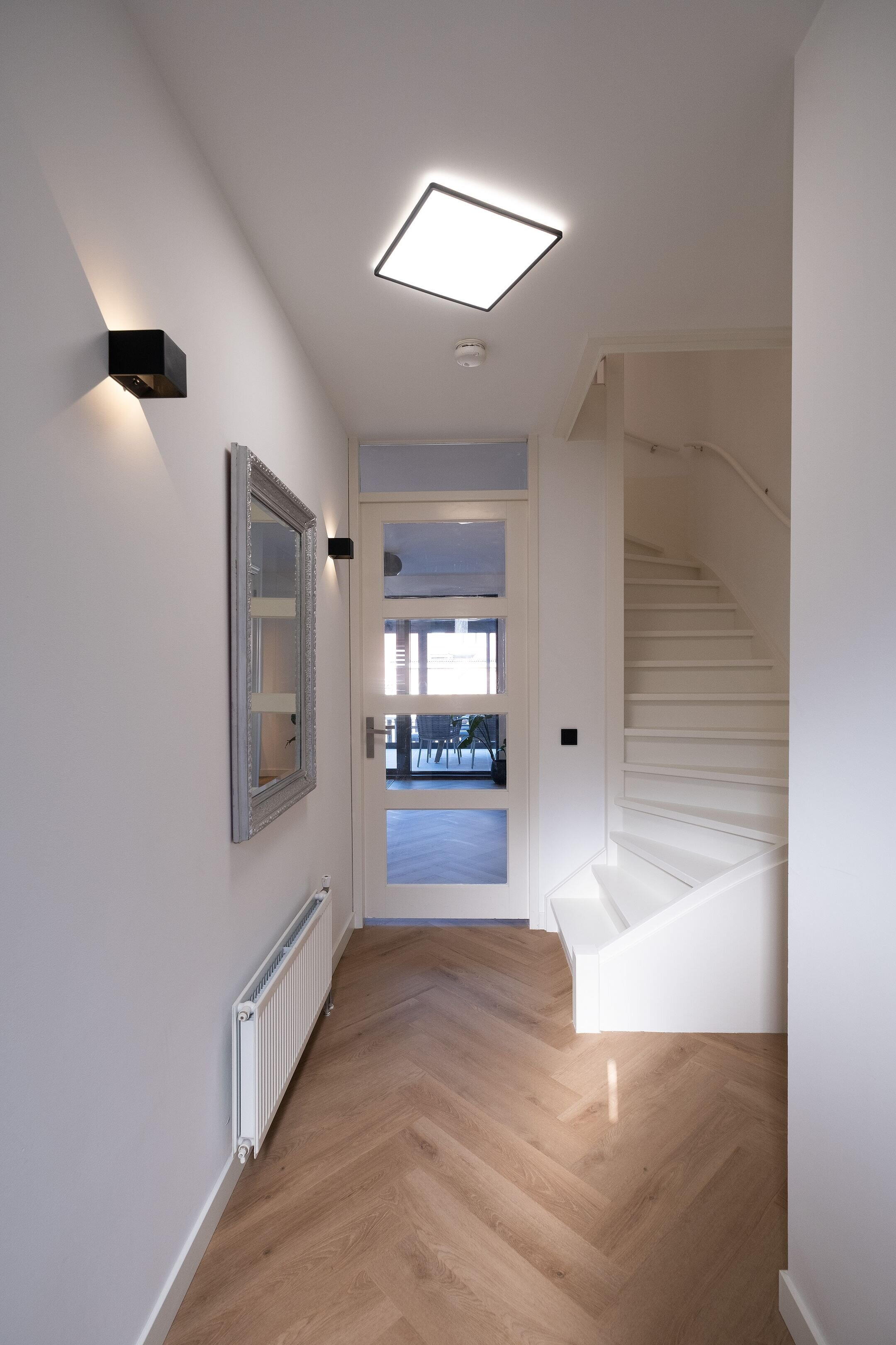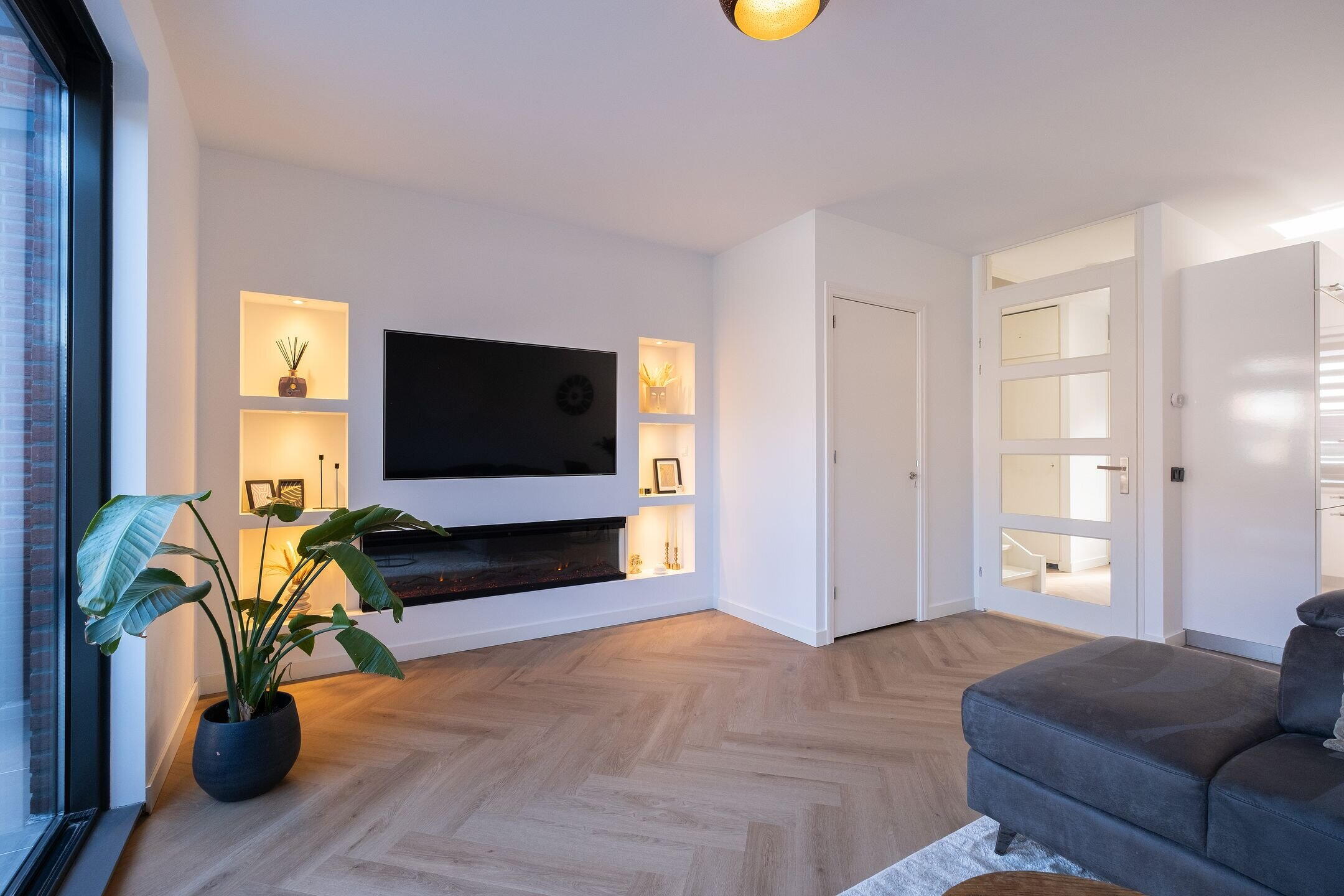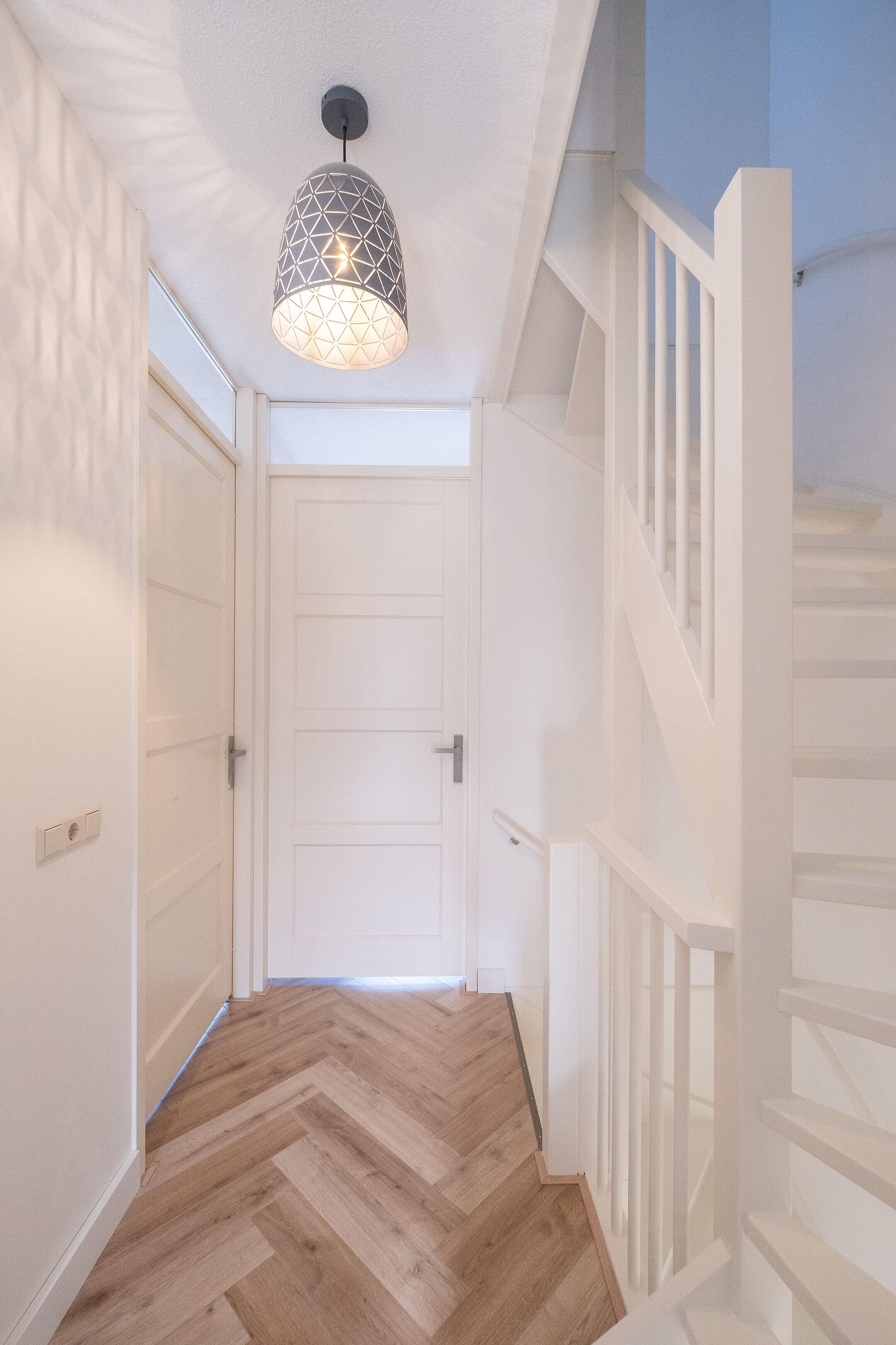 Via de entree kom je in de hal met meterkast en de trapopgang naar boven. De woonkamer is tuingericht en heerlijk licht dankzij de grote raampartijen en schuifdeuren naar de achtertuin. De afwerking is heel strak met gladde wanden en plafond, mooi afgewerkte cinewall en PVC vloer met visgraad. Vanuit de woonkamer stap je zo de serre in voorzien van tegelvloer en sfeervolle verlichting wat zorgt voor veel extra leefruimte.