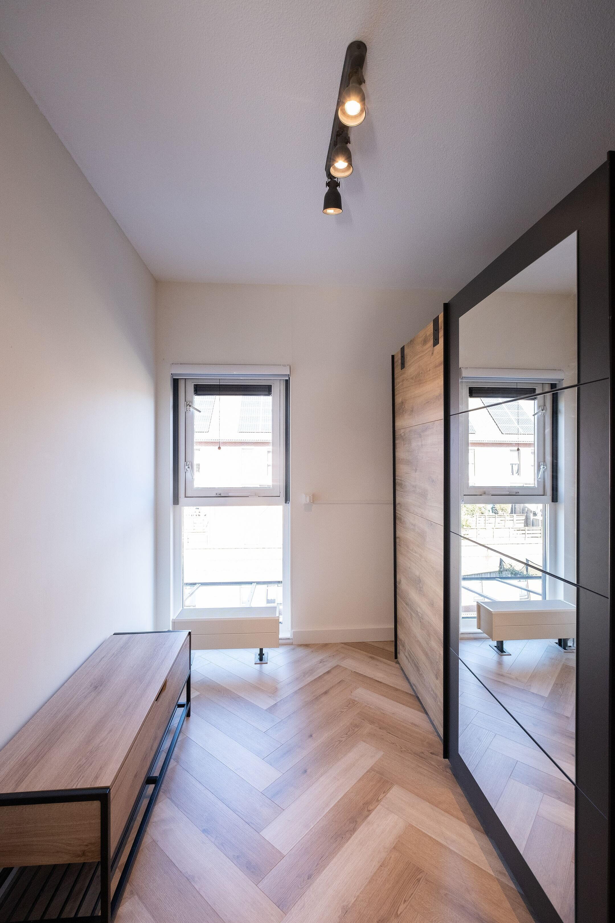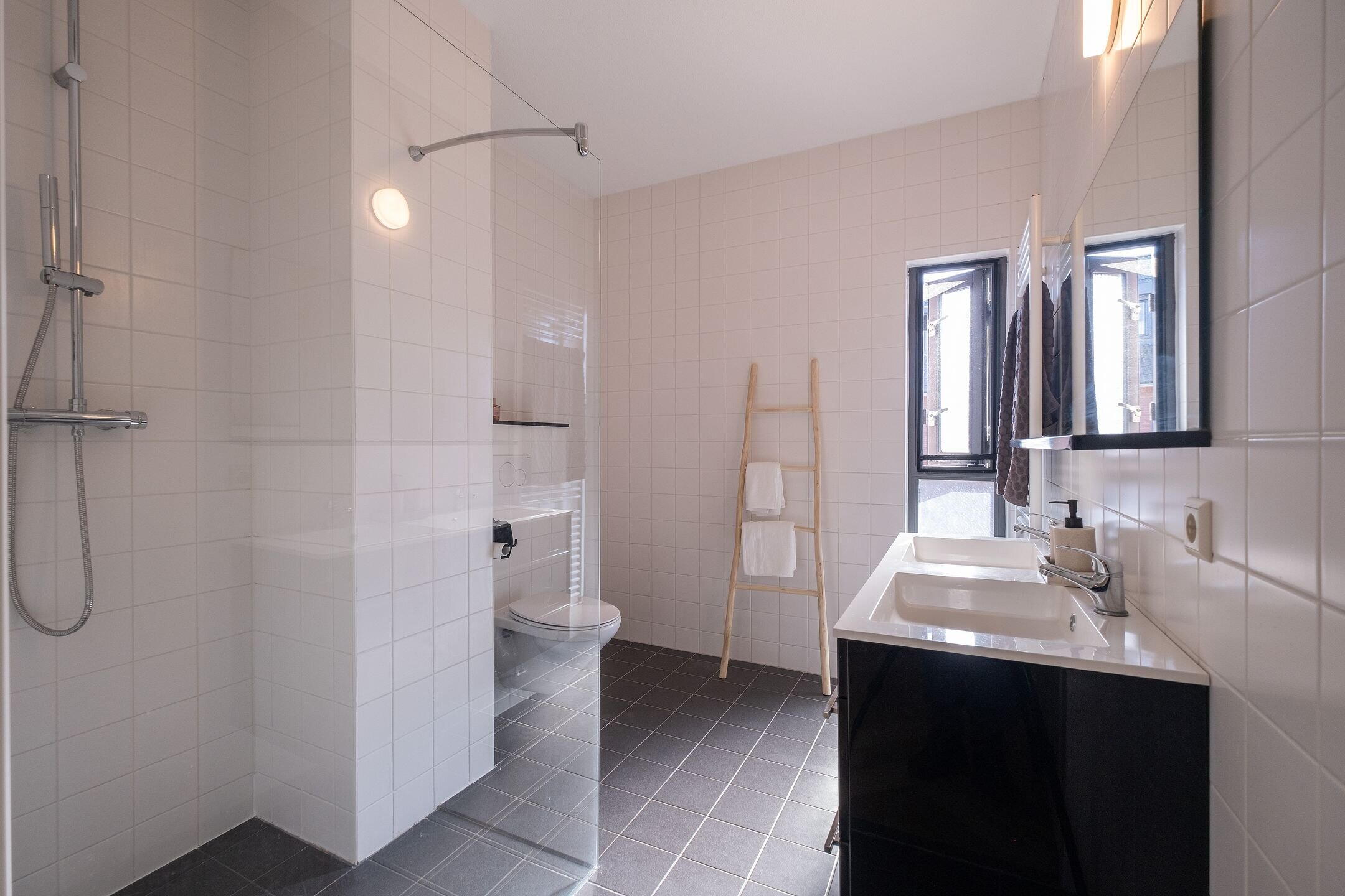 De badkamer is compleet uitgevoerd met een inloopdouche, toilet, wastafelmeubel, designradiator, mechanische ventilatie en een raam voor daglicht en ventilatie.