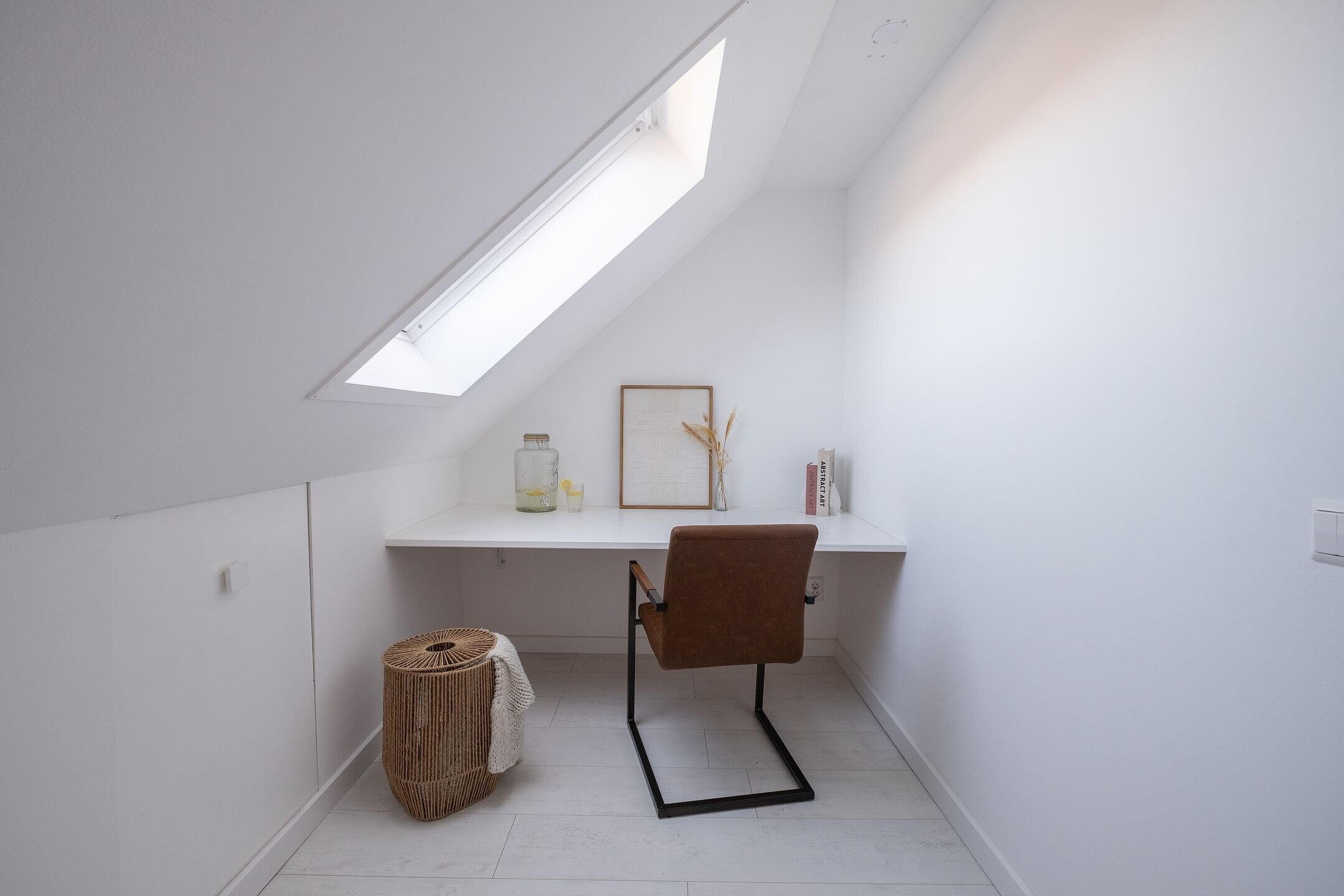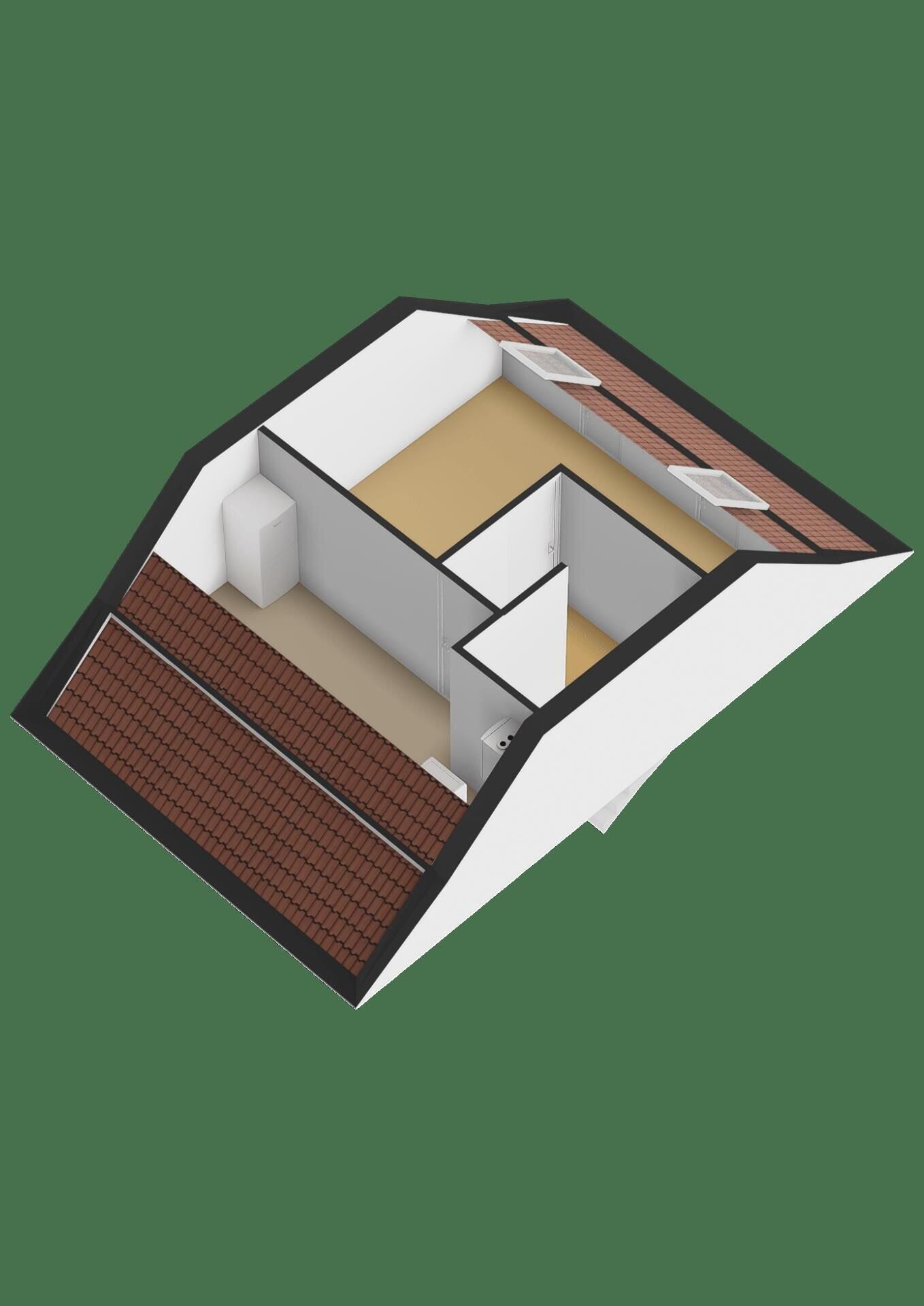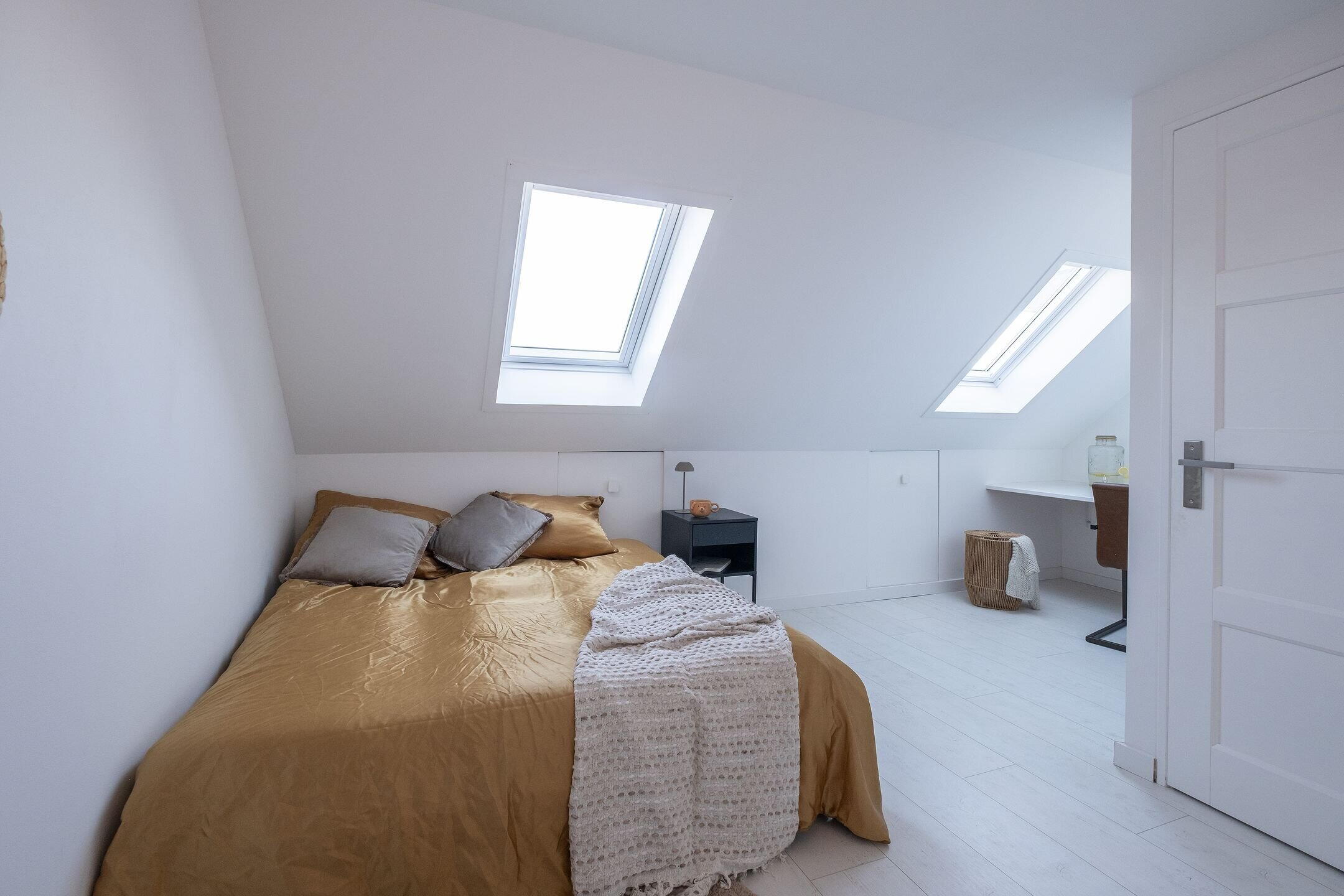 Via de vaste trap bereik je de tweede verdieping met een vierde slaapkamer. Deze ruimte is licht en netjes afgewerkt met twee dakramen en een laminaatvloer.