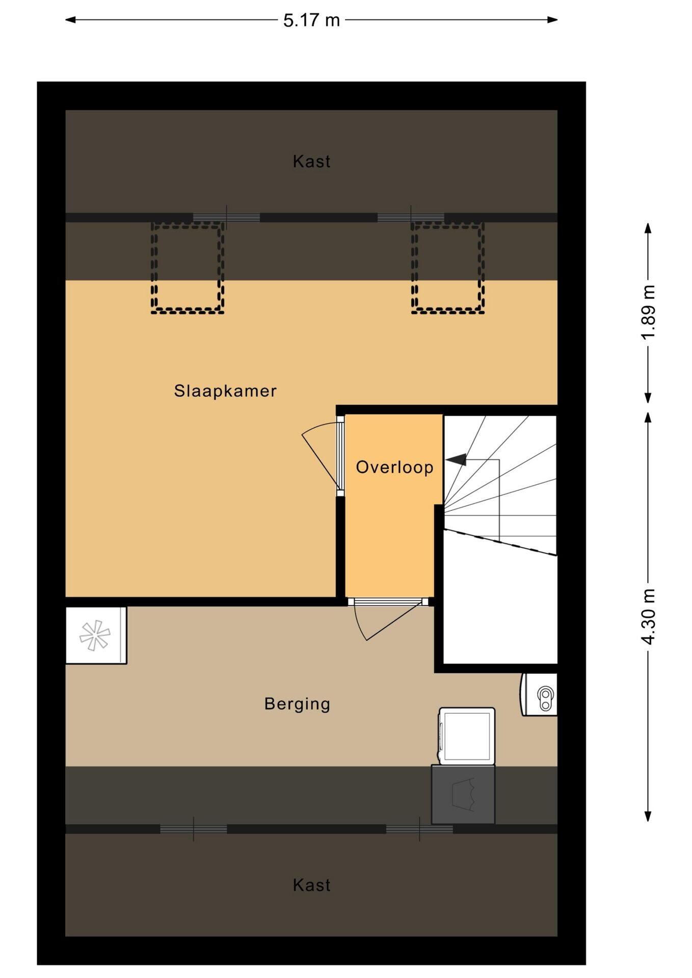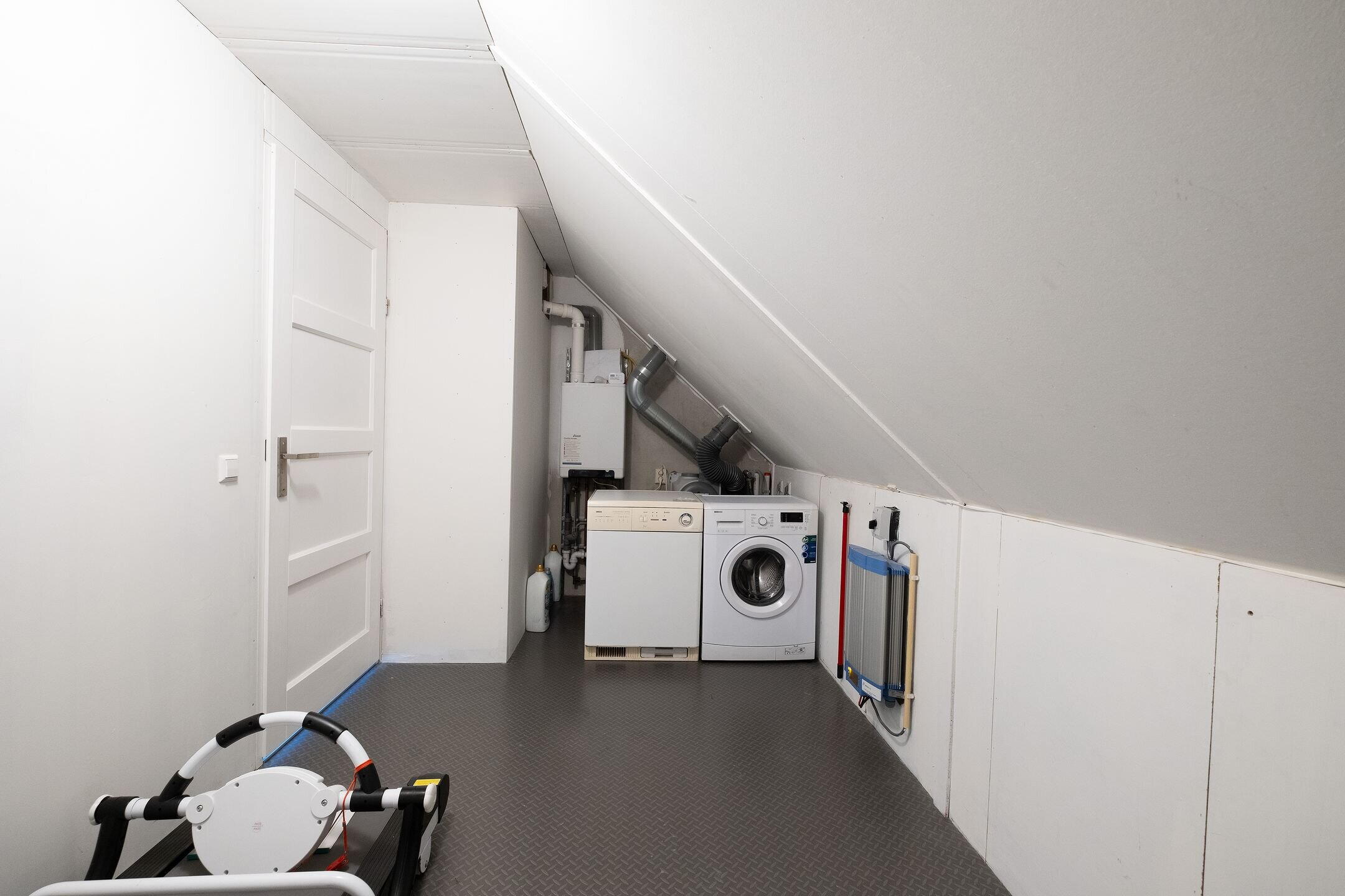 Daarnaast is er een aparte ruime bergruimte met de aansluitingen voor wasmachine en droger, de CV-installatie en de omvormer voor de zonnepanelen.