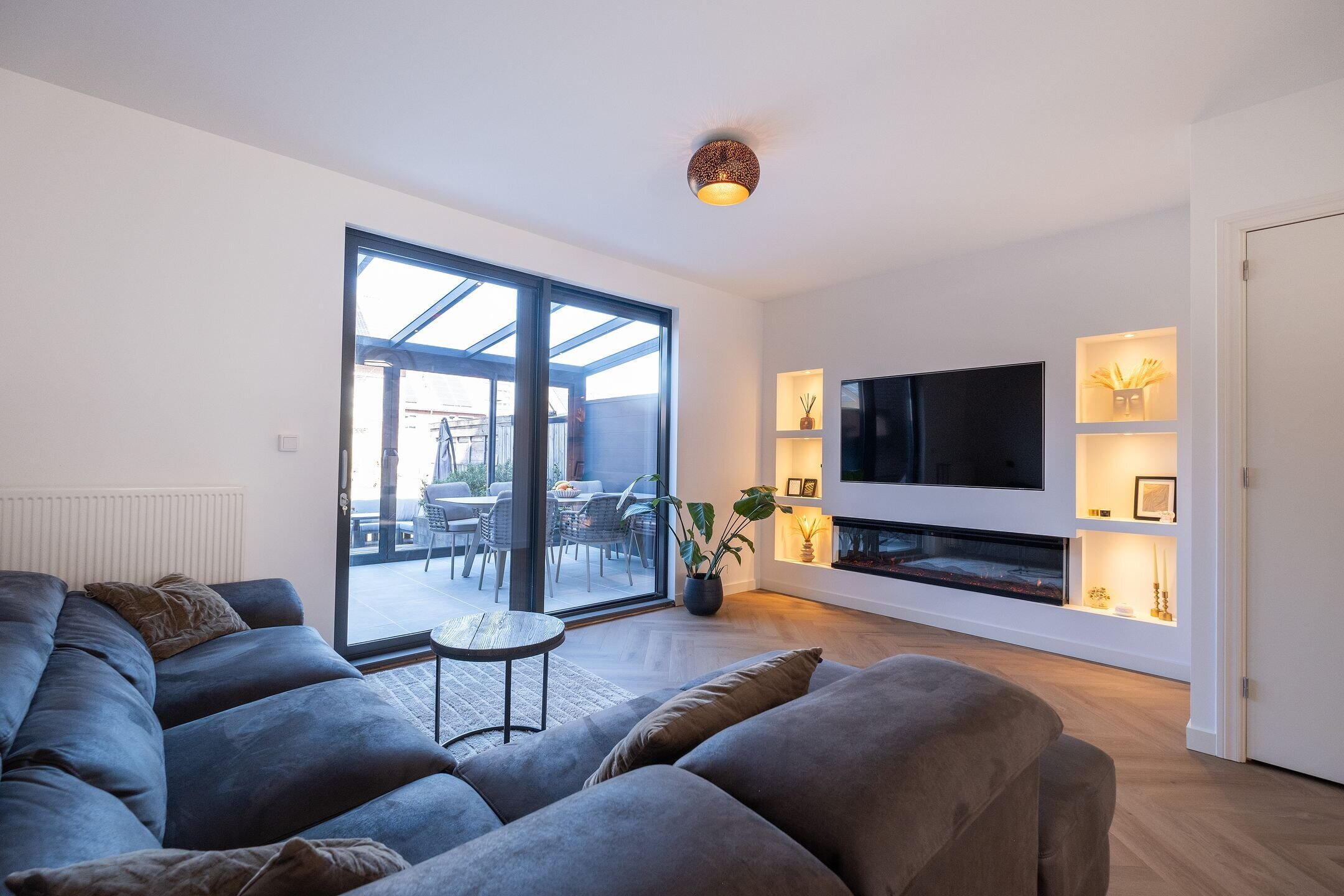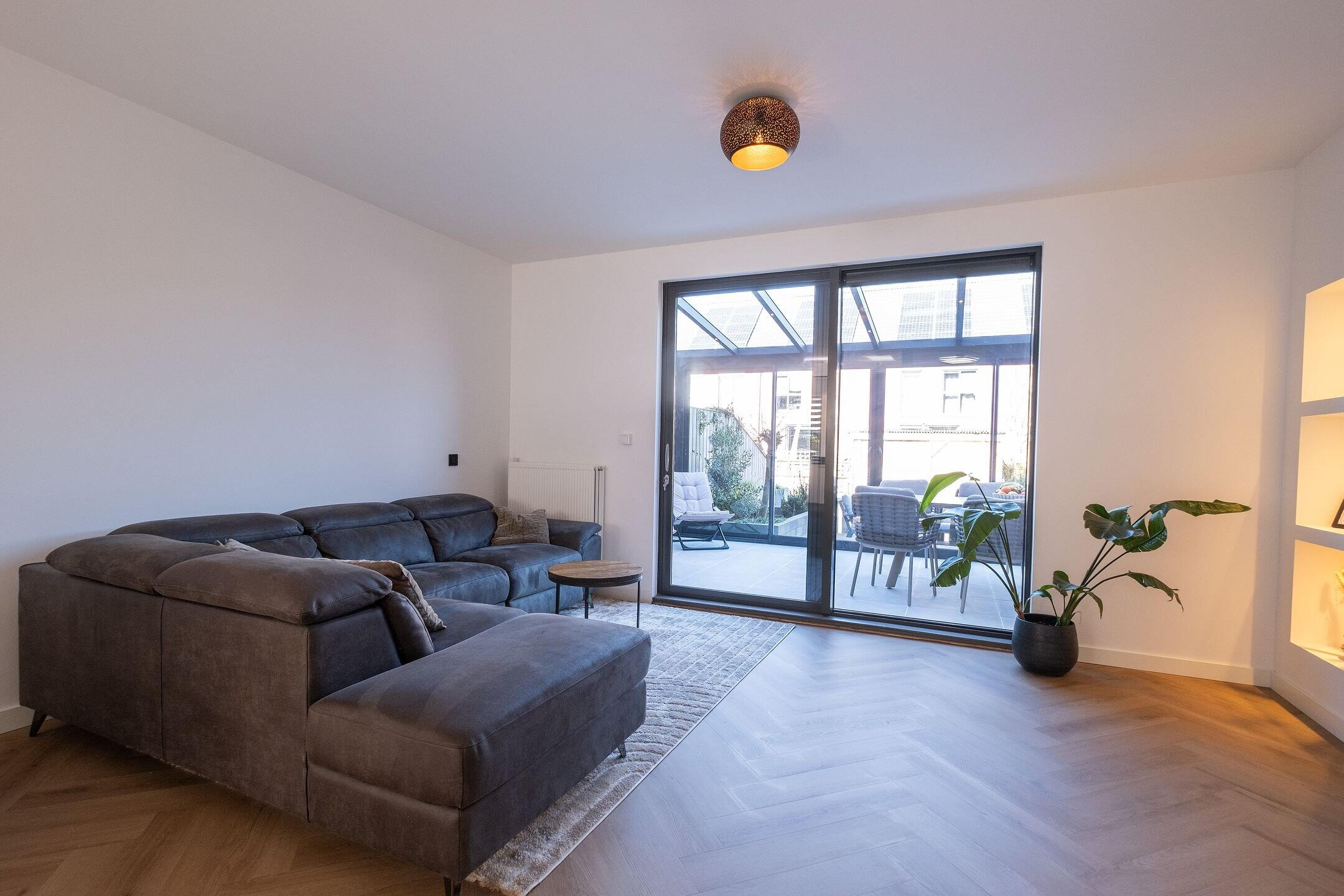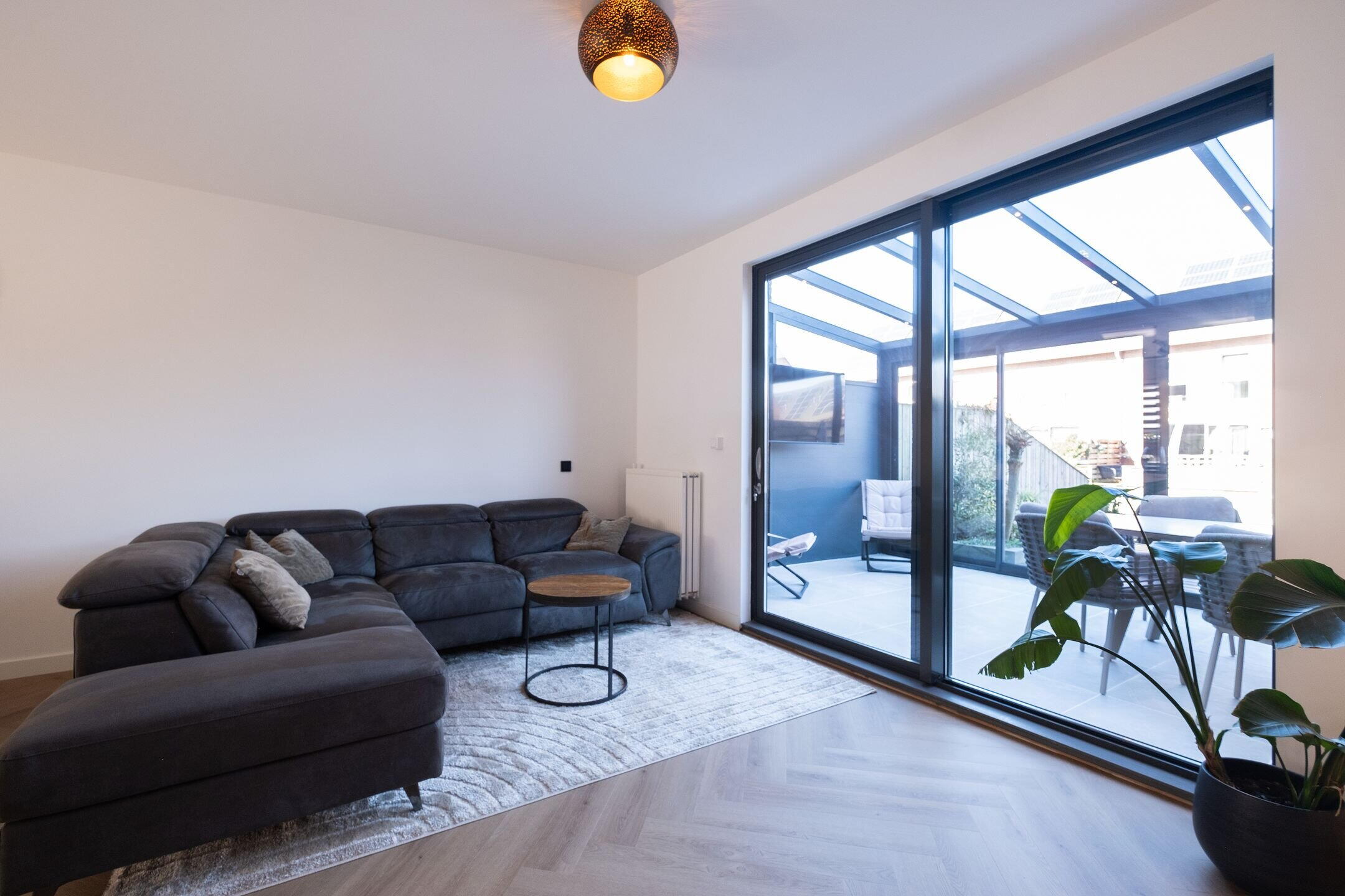 - Lichte woonkamer met schuifdeuren naar de tuin